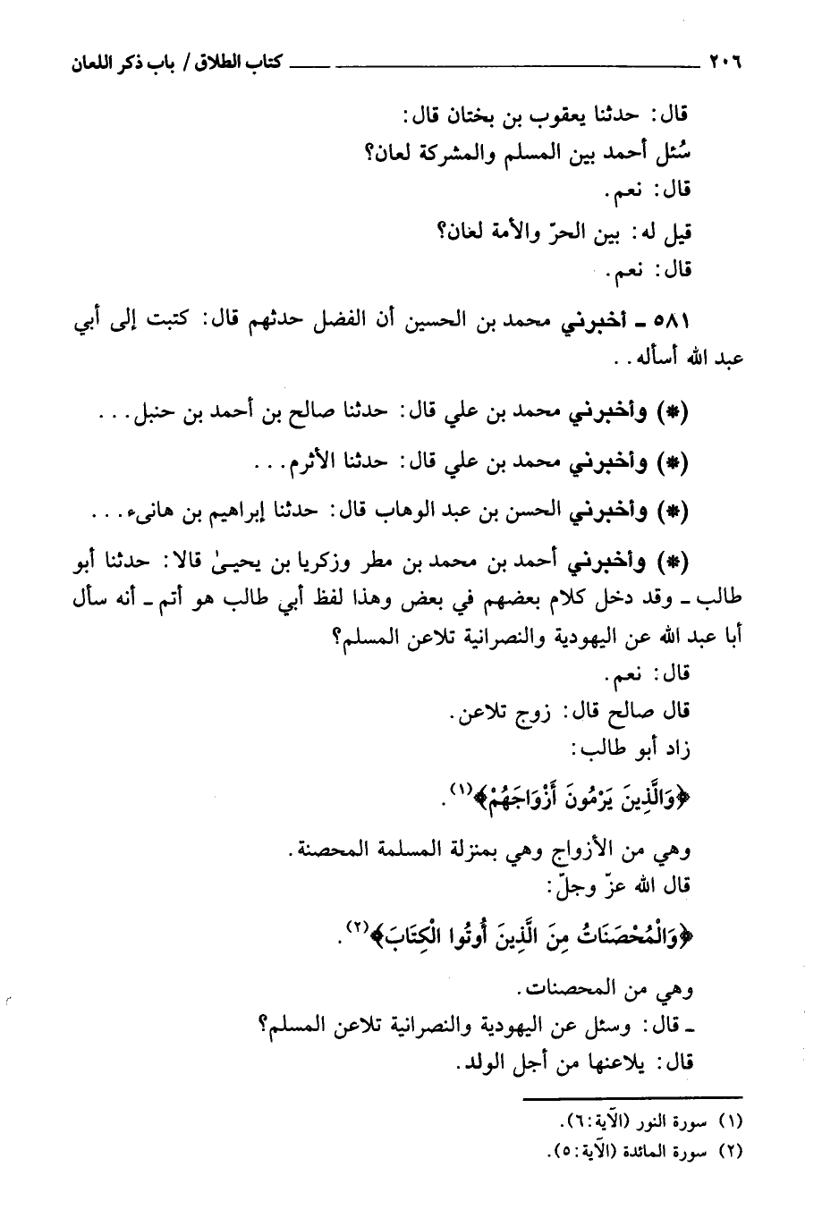 581 - أَخْبَرَنِي محمد بن الحسين، أن الفضل حدثهم، قَالَ: كتبت إلى أبي عبد الله أسأله، وأخبرني محمد بن علي، قَالَ: حَدَّثَنَا صالح بن أحمد بن حنبل، وأخبرني محمد بن علي، قَالَ: حَدَّثَنَا الأثرم، وأخبرني الحسن بن عبد الوهاب، قَالَ: حَدَّثَنَا إبراهيم بن هانئ، وأخبرني أحمد بن محمد بن مطر، وزكريا بن يحيى، قالا: حَدَّثَنَا أبو طالب، وقد دخل كلام بعضهم في بعض، وهذا لفظ أبي طالب، وهو أتم: أنه سأل أبا عبد الله عن اليهودية والنصرانية، تلاعن المسلم؟ قَالَ: نعم.