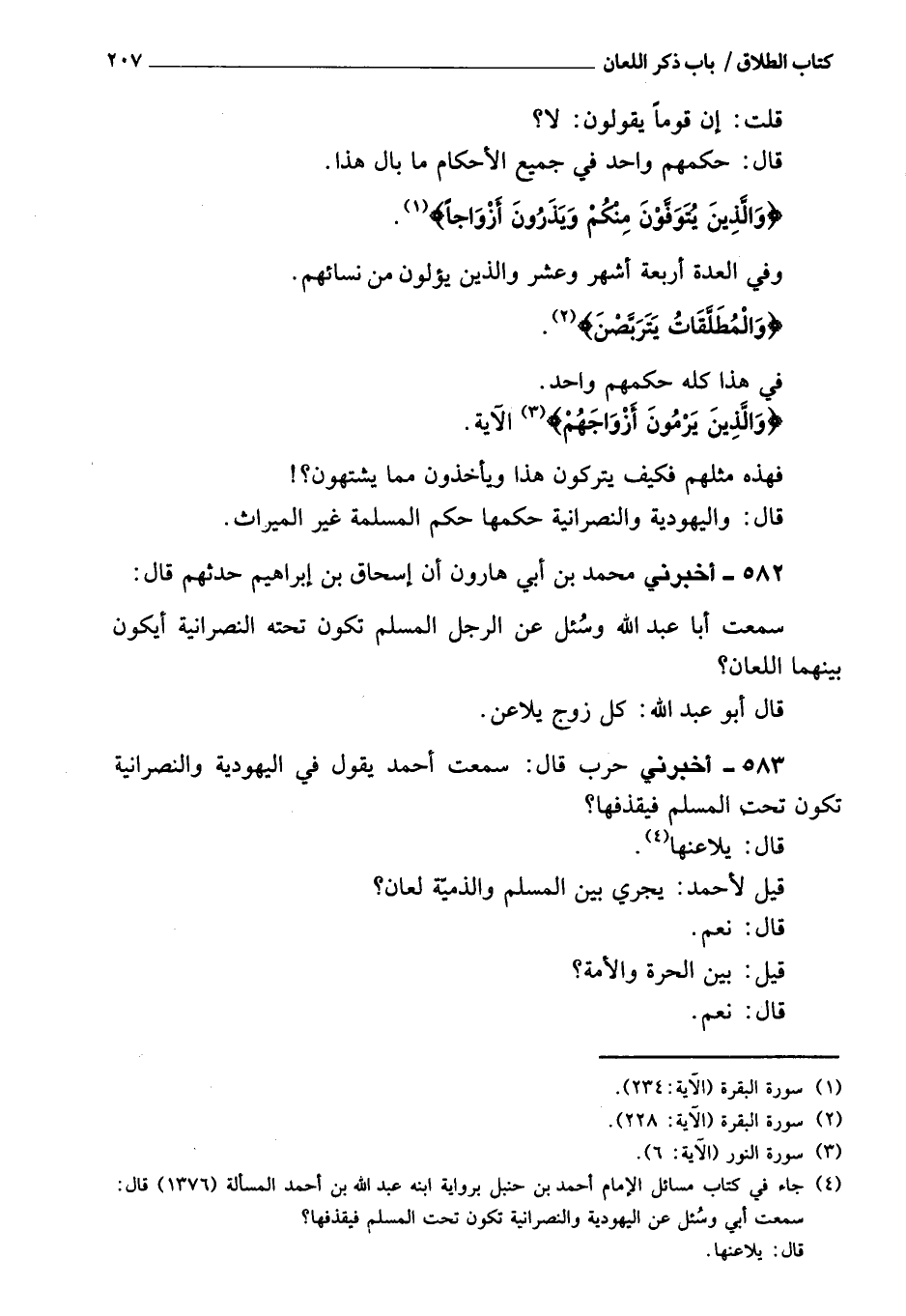 583 - أَخْبَرَنِي حرب، قَالَ: سمعت أحمد يقول في اليهودية والنصرانية تكون تحت المسلم فيقذفها.