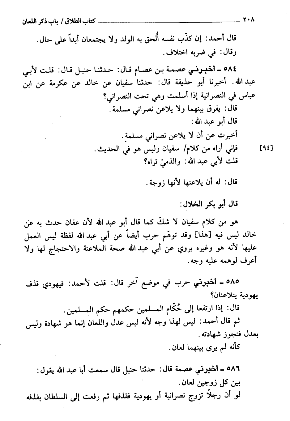 586 - أَخْبَرَنِي عصمة، قَالَ: حَدَّثَنَا حنبل، قَالَ: سمعت أبا عبد الله يقول: بين كل زوجين لعان، لو أن رجلا تزوج نصرانية، أو يهودية وقذفها، ثم رفعته إلى السلطان بقذفه