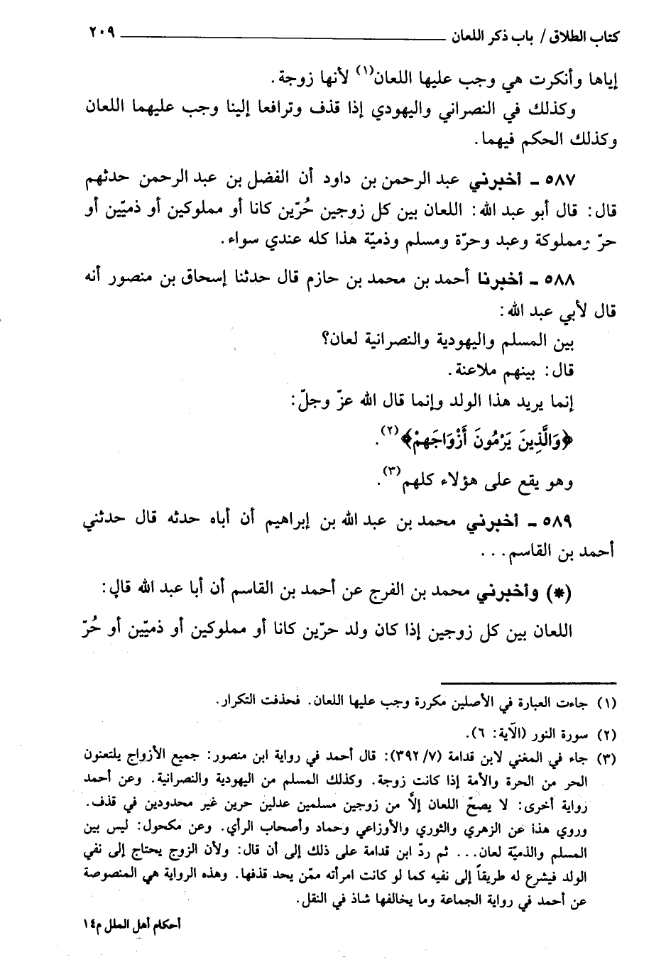 588 - أَخْبَرَنِي أحمد بن محمد بن حازم، قَالَ: حَدَّثَنَا إسحاق بن منصور، أنه قَالَ لأبي عبد الله: بين المسلم واليهودية والنصرانية لعان؟ قَالَ: بينهم ملاعنة، إنما يريد به الولد، وإنما قَالَ الله، عز وجل: {وَالَّذِينَ يَرْمُونَ أَزْوَاجَهُمْ} [النور: 6] وهو يقع على هؤلاء كلهم