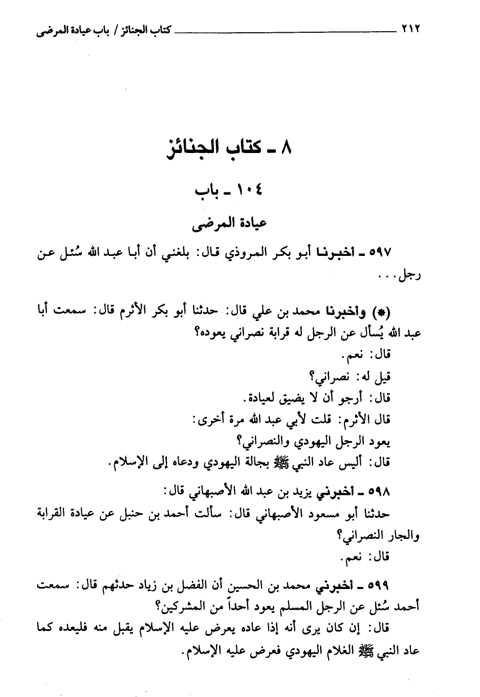599 - أَخْبَرَنِي محمد بن الحسين، أن الفضل بن زياد حدثهم، قَالَ: سمعت أحمد يسأل عن الرجل المسلم، يعود أحدا من المشركين؟ قَالَ: إن كان يرى أنه إذا عاده يعرض عليه الإسلام يقبل منه، فليعده كما عاد النبي، صَلَّى اللَّهُ عَلَيْهِ وَسَلَّمَ، الغلام اليهودي، فغرض عليه الإسلام