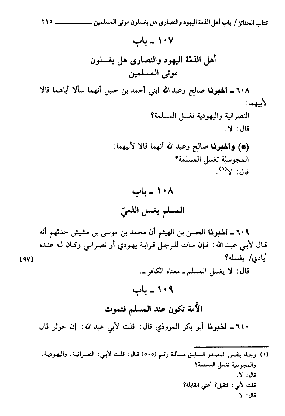 608 - أَخْبَرَنَا صالح وعبد الله ابني أحمد بن حنبل، أنهما سألا أباهما، قالا لأبيهما: النصرانية واليهودية، تغسل المسلمة؟ قَالَ: لا