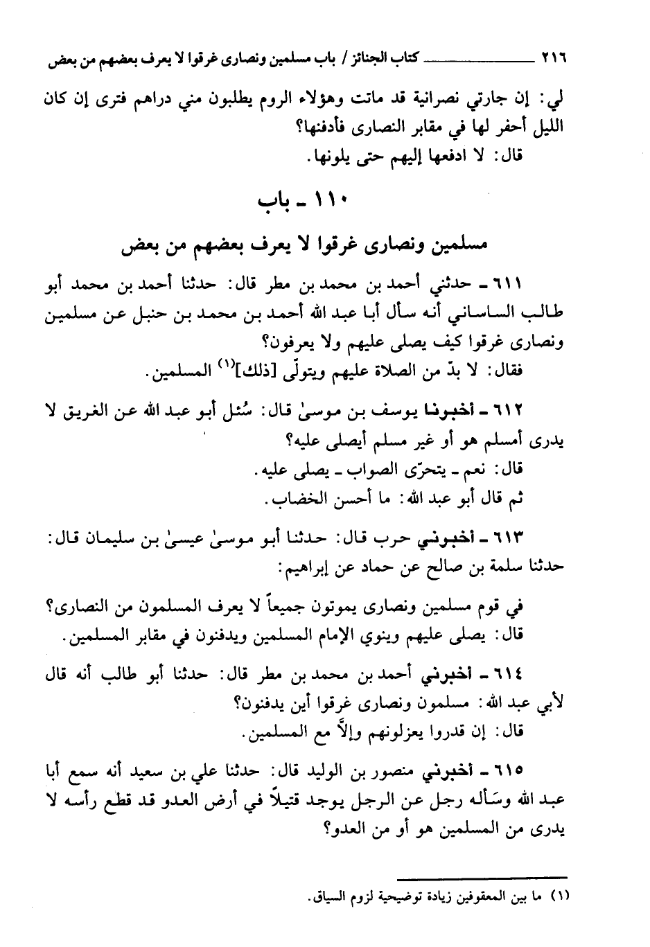 611 - حَدَّثَنِي أحمد بن محمد بن مطر، قَالَ: حَدَّثَنَا أحمد بن محمد، أبو طالب السلماني، أنه سأل أبا عبد الله، أحمد بن محمد بن حنبل، عن مسلمين ونصارى غرقوا: كيف يصلى عليهم ولا يعرفون؟ فقال: لابد من الصلاة عليهم، وينوى عليهم