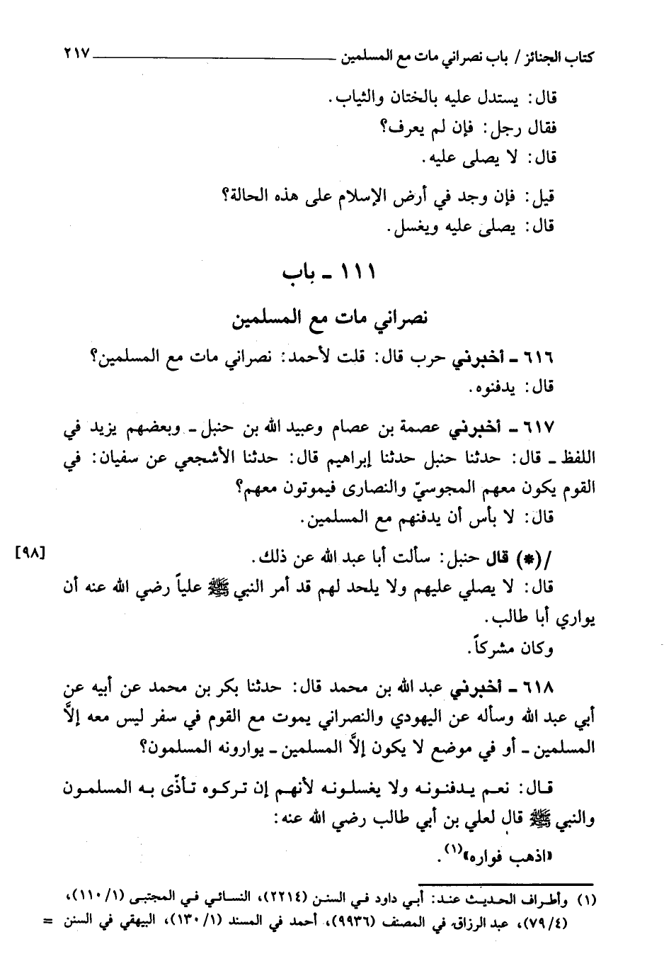 618 - أَخْبَرَنِي عبد الله بن محمد، قَالَ: حَدَّثَنَا بكر بن محمد، عن أبيه، عن أبي عبد الله وسأله عن اليهودي والنصراني، يموت مع القوم في سفر ليس معه إلا المسلمون، أو في موضع لا يكون إلا المسلمون، يواريه المسلمون؟ قَالَ: نعم، يدفنونه ولا يغسلونه؛ لأنهم إن تركوه تأذى به المسلمون، والنبي، صَلَّى اللَّهُ عَلَيْهِ وَسَلَّمَ، قَالَ لعلي بن أبي طالب، رَضِيَ اللَّهُ عَنْهُ: «اذهب فواره» ،