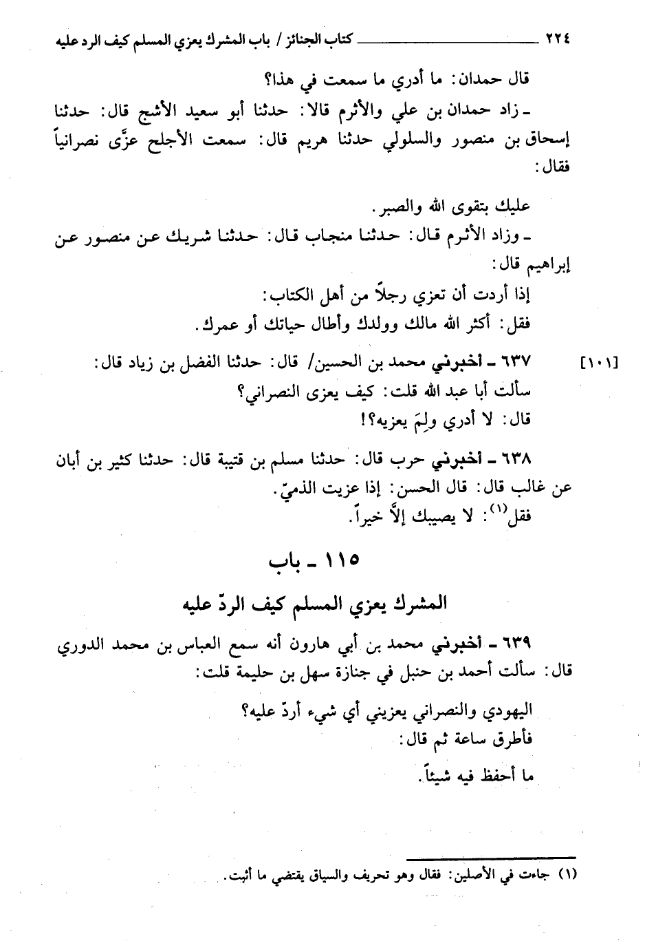 639 - أَخْبَرَنِي محمد بن أبي هارون، أنه سمع العباس بن محمد الدوري، قَالَ: سألت أحمد بن حنبل في جنازة سهل بن حليمة، قلت: اليهودي والنصراني يعزيني، أي شيء أرد عليه؟ فأطرق ساعة، ثم قَالَ: ما أحفظ فيه شيئا
