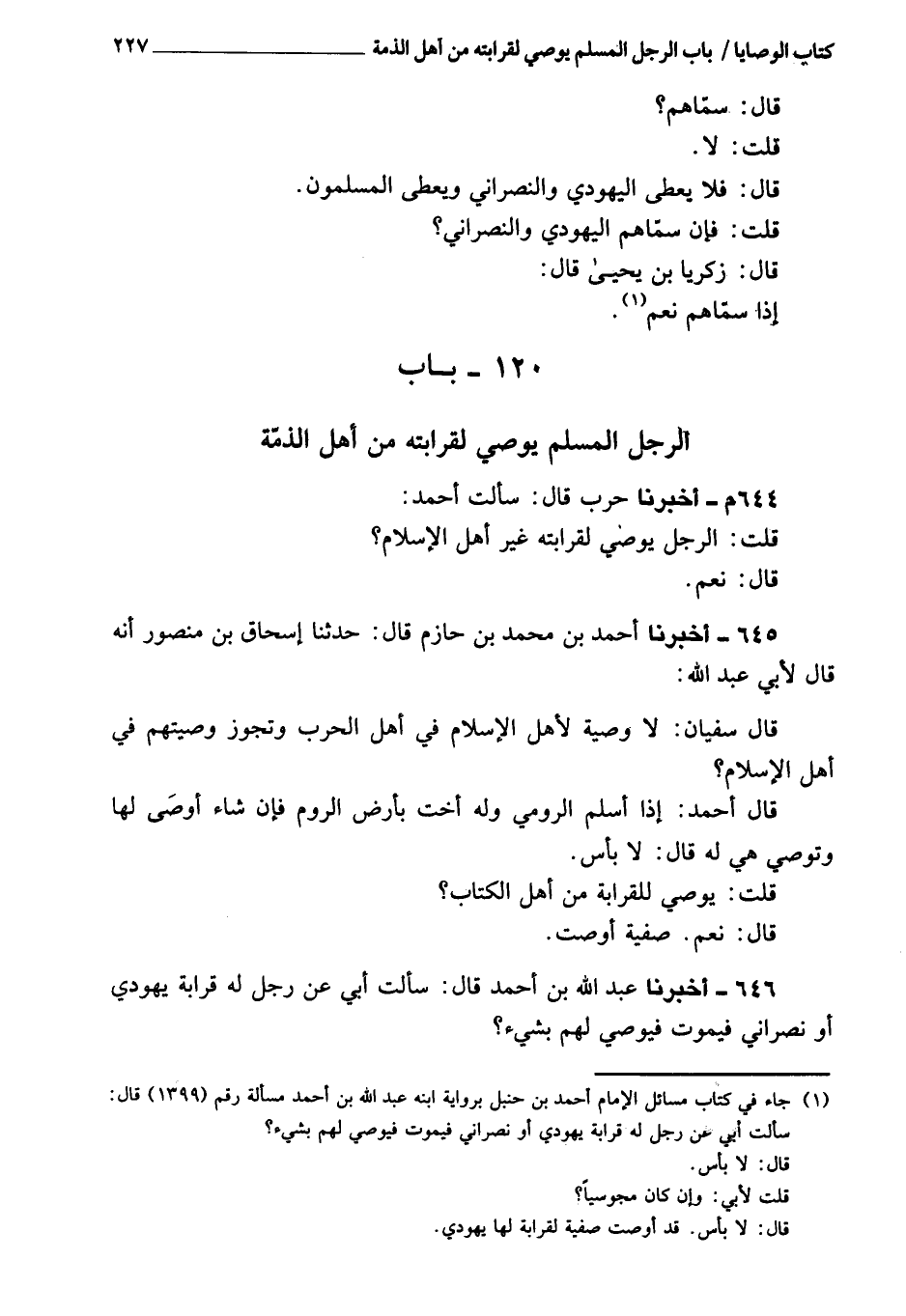 646 - أَخْبَرَنَا عبد الله بن أحمد، قَالَ: سألت أبي عن رجل له قرابة يهودي، أو نصراني، فيموت، فيوصي لهم بشيء؟
