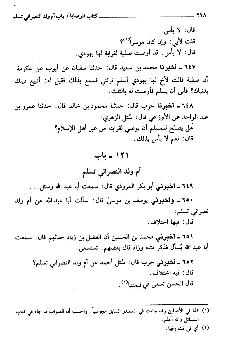 648 - أَخْبَرَنَا حرب، قَالَ: حَدَّثَنَا محمود بن خالد، قَالَ: حَدَّثَنَا عمر بن عبد الواحد، عن الأوزاعي، قَالَ: سئل الزهري: هل يصلح للمسلم أن يوصي لقرابته من غير أهل الإسلام؟ قَالَ: نعم، لا بأس بذلك
