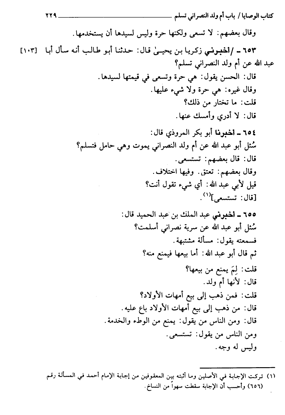 653 - أَخْبَرَنِي زكريا بن يحيى، قَالَ: حَدَّثَنَا أبو طالب، أنه سأل أبا عبد الله عن أم ولد النصراني تسلم؟ قَالَ: الحسن يقول: هي حرة، ويسعى في قيمتها لسيدها.
