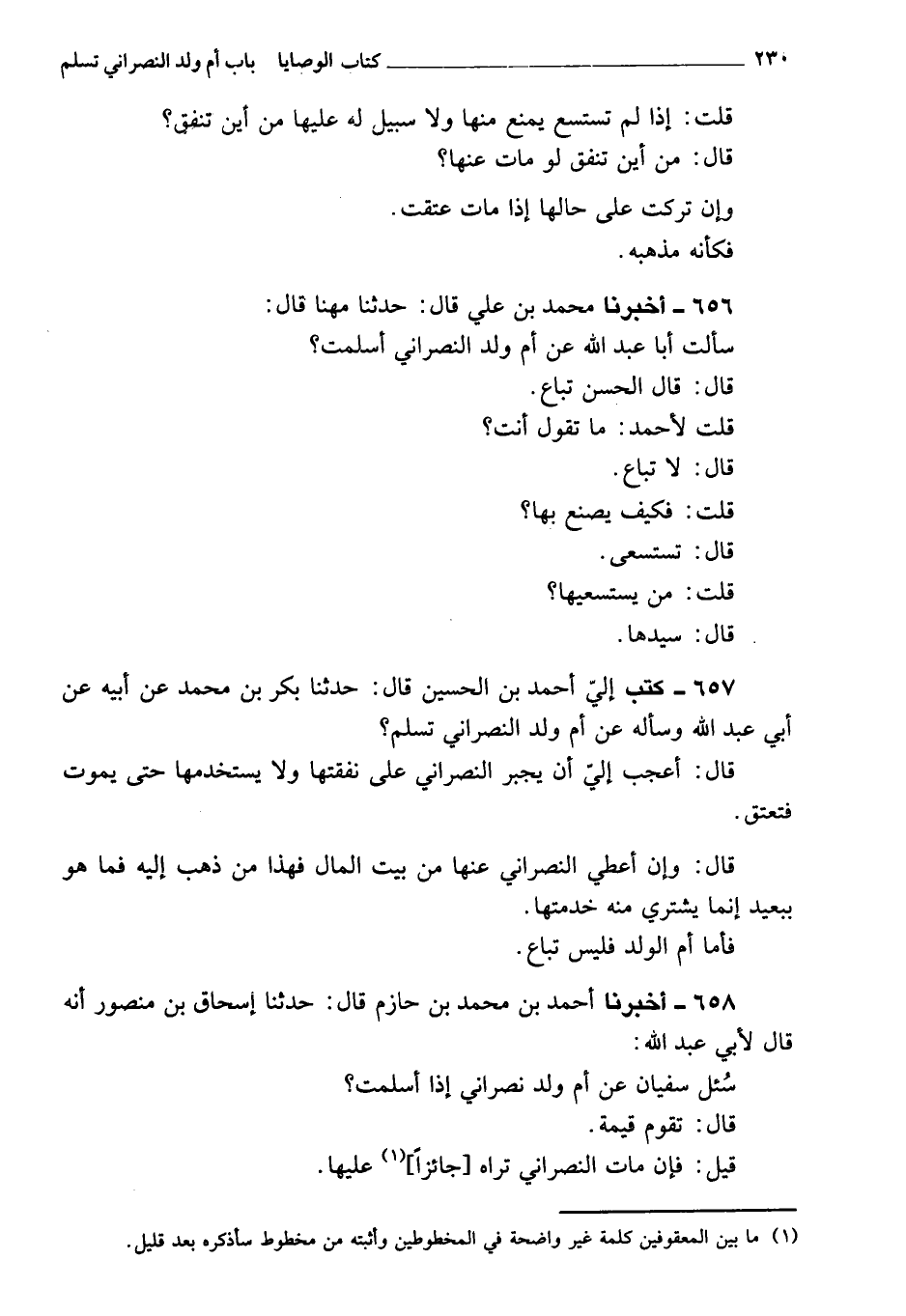 658 - أَخْبَرَنَا أحمد بن محمد بن حازم، قَالَ: حَدَّثَنَا إسحاق بن منصور، أنه قَالَ لأبي عبد الله: سئل سفيان عن أم ولد النصراني إذا أسلمت؟ قَالَ: تقوم قيمة.