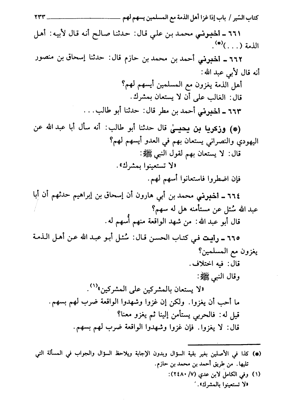663 - أَخْبَرَنِي أحمد بن مُحَمَّد بن مطر، قَالَ: حَدَّثَنَا أبو طالب، وزكريا بن يَحْيَى، قَالَ: حَدَّثَنَا أبو طالب: أنه سأل أبا عبد الله عن اليهودي والنصراني؛ يستعان بهم فِي العدو: أيسهم لهم؟ قَالَ: لا يستعان بهم؛ لقول النبي، صَلَّى اللَّهُ عَلَيْهِ وَسَلَّمَ: «لا نستعين بمشرك» .