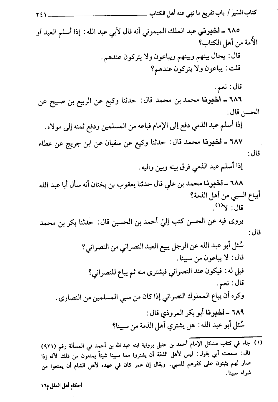 688 - أَخْبَرَنَا مُحَمَّد بن علي، قَالَ: حَدَّثَنَا يعقوب بن بختان، أنه سأل أبا عبد الله: أيباع السبي من أهل الذمة؟ قَالَ: لا.