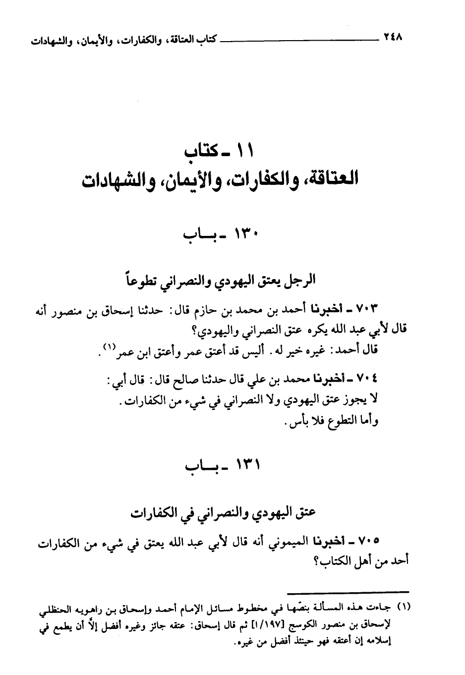 703 - أَخْبَرَنَا مُحَمَّد بن حازم، قَالَ: حَدَّثَنَا إسحاق بن منصور، أنه قَالَ لأبي عبد الله: يكره عتق النصراني واليهودي؟ قَالَ أحمد: غيره خير له، أليس قد أعتق عمر، وأعتق ابن عمر؟ .