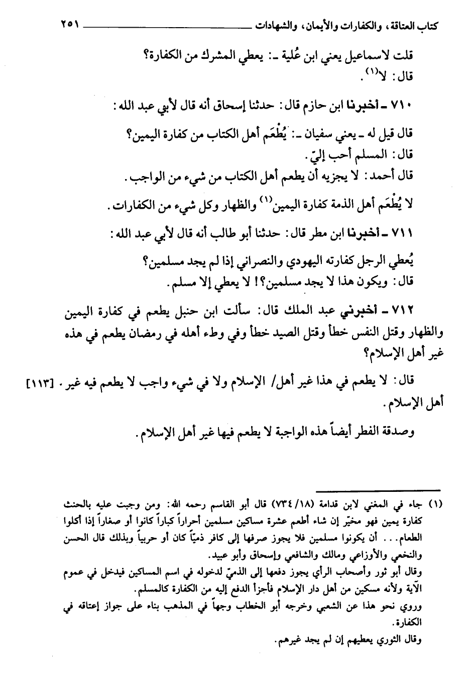 712 - أَخْبَرَنِي عبد الملك، قَالَ: سألت ابن حنبل: يطعم من كفارة اليمين والظهار، وقتل النفس خطأ، وقتل العبد خطأ، وفي وطء أهله فِي رمضان، يطعم هذه غير أهل الإسلام؟ قَالَ: لا يطعم فِي هذا غير أهل الإسلام، ولا فِي شيء واجب، لا يطعم فِيهِ غير أهل الإسلام، وصدقة الفطر أيضا هذه الواجبة لا يطعم فِيهَا غير أهل الإسلام.