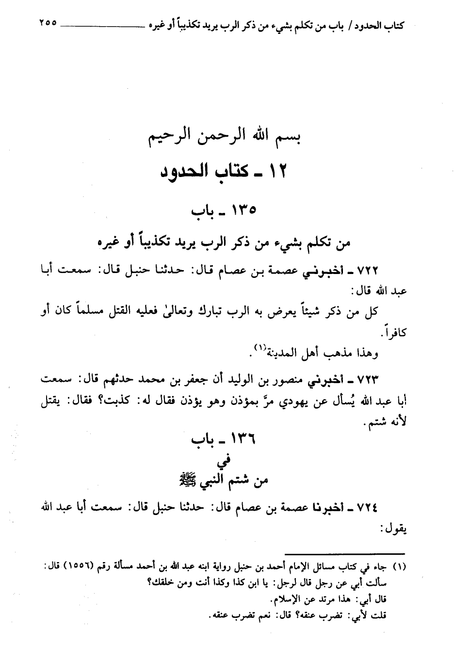 722 - أَخْبَرَنِي عصمة بن عصام، قَالَ: حَدَّثَنَا حنبل، قَالَ: سمعت أبا عبد الله، قَالَ: كل من ذكر شيئا يعرض بِهِ الرب، تبارك وتعالى، فعليه القتل مسلما كان، أو كافرا.