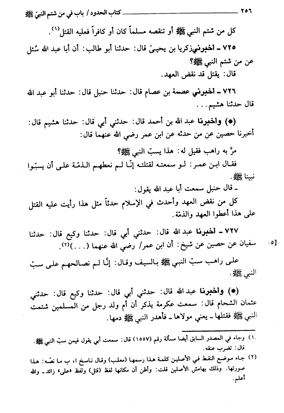 726 - أَخْبَرَنِي عِصْمَةُ بْنُ عِصَامٍ، قَالَ: حَدَّثَنَا حَنْبَلٌ، قَالَ: حَدَّثَنِي أَبُو عَبْدِ اللَّهِ، قَالَ: حَدَّثَنَا هُشَيْمٌ، وَأَخْبَرَنَا عَبْدُ اللَّهِ بْنُ أَحْمَدَ، قَالَ: حَدَّثَنِي أَبِي، قَالَ: حَدَّثَنَا هُشَيْمٌ، قَالَ: أَخْبَرَنَا حُصَيْنٌ، عَمَّنْ حَدَّثَهُ، عَنِ ابْنِ عُمَرَ، رَضِيَ اللَّهُ عَنْهُمَا، قَالَ: مَرَّ بِهِ رَاهِبٌ، فَقِيلَ لَهُ: هَذَا يَسُبُّ النَّبِيَّ، صَلَّى اللَّهُ عَلَيْهِ وَسَلَّمَ، فَقَالَ ابْنُ عُمَرَ: لَوْ سَمِعْتُهُ لَقَتَلْتُهُ، إِنَّا لَمْ نُعْطِهِمُ الذِّمَّةَ عَلَى أَنْ يَسُبُّوا نَبِيَّنَا، صَلَّى اللَّهُ عَلَيْهِ وَسَلَّمَ