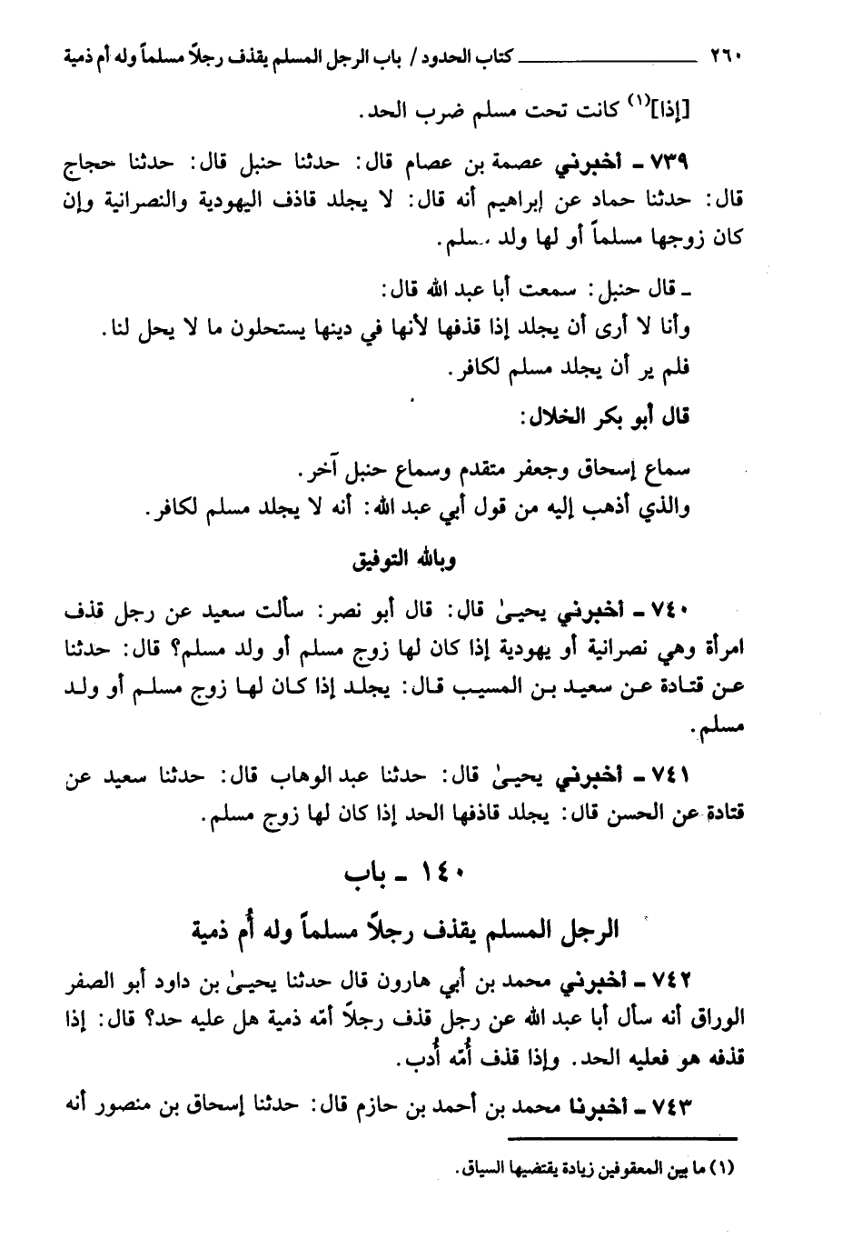 739 - وَأَخْبَرَنِي عصمة بن عصام، قَالَ: حَدَّثَنَا حنبل، قَالَ: حَدَّثَنَا حجاج، قَالَ: حَدَّثَنَا حماد بن إبراهيم، أنه قَالَ: لا يجلد قاذف اليهودية والنصرانية، وإن كان زوجها مسلما، ولها ولد مسلم.