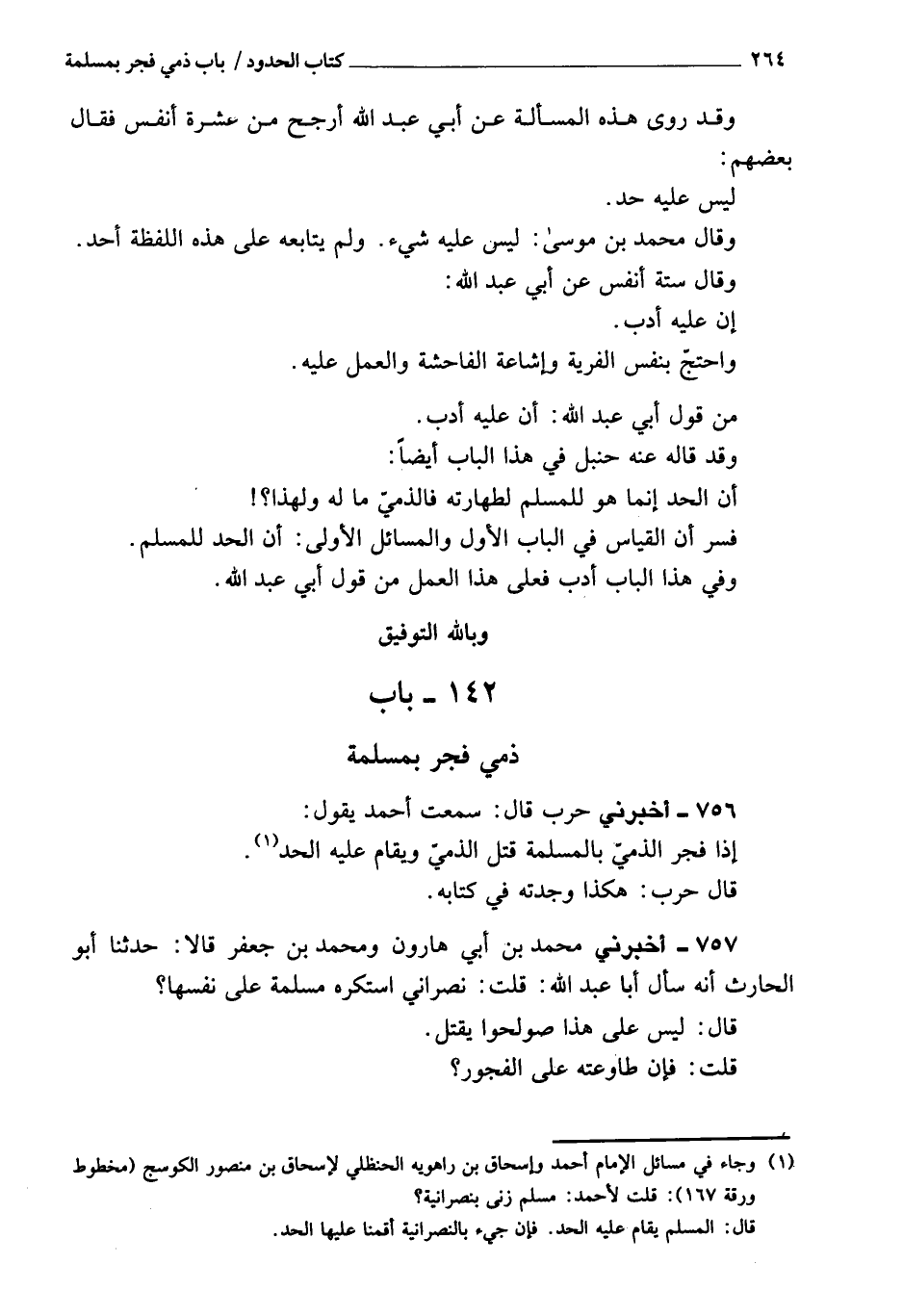757 - أَخْبَرَنِي محمد بن أبي هارون، ومحمد بن جعفر، قَالا: حَدَّثَنَا أبو الحارث أنه سأل أبا عبد الله، قَالَ: قُلْتُ: نصراني استكره مسلمة عَلَى نفسها؟ قَالَ: ليس عَلَى هذا صولحوا، يقتل.