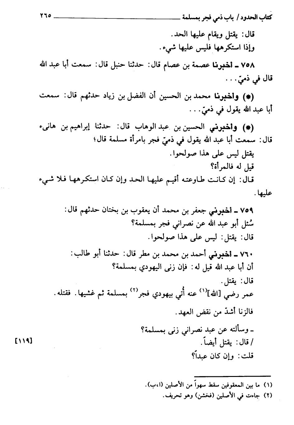 759 - أَخْبَرَنِي جعفر بن مُحَمَّد، أن يعقوب بن بختان حدثهم، قَالَ: سئل أبو عبد الله عن نصراني فجر بمسلمة؟ قَالَ: يقتل، ليس عَلَى هذا صولحوا.