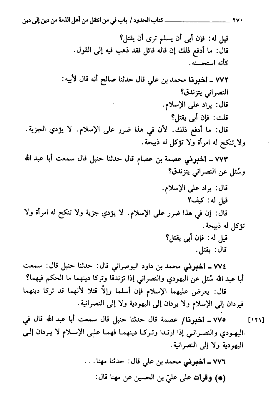 773 - أَخْبَرَنِي عصمة بن عصام، قَالَ: حَدَّثَنَا حنبل، قَالَ: سمعت أبا عبد الله، وسئل عن النصراني يتزندق؟ قَالَ: يراد عَلَى الإسلام.
