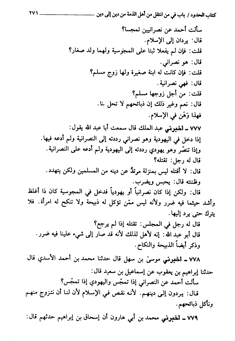 778 - أَخْبَرَنِي موسى بن سهل، قَالَ: حَدَّثَنَا مُحَمَّد بن أحمد الأسدي، قَالَ: حَدَّثَنَا إبراهيم بن يعقوب، عن إسماعيل بن سعيد، قَالَ: سألت أحمد عن النصراني إذا تمجس، أو اليهودي إذا تمجس؟ قَالَ: يردون إلى دينهم؛ لأنهم نقص فِي الإسلام؛ لأن لنا أن نتزوج فيهم، ونأكل ذبائحهم.