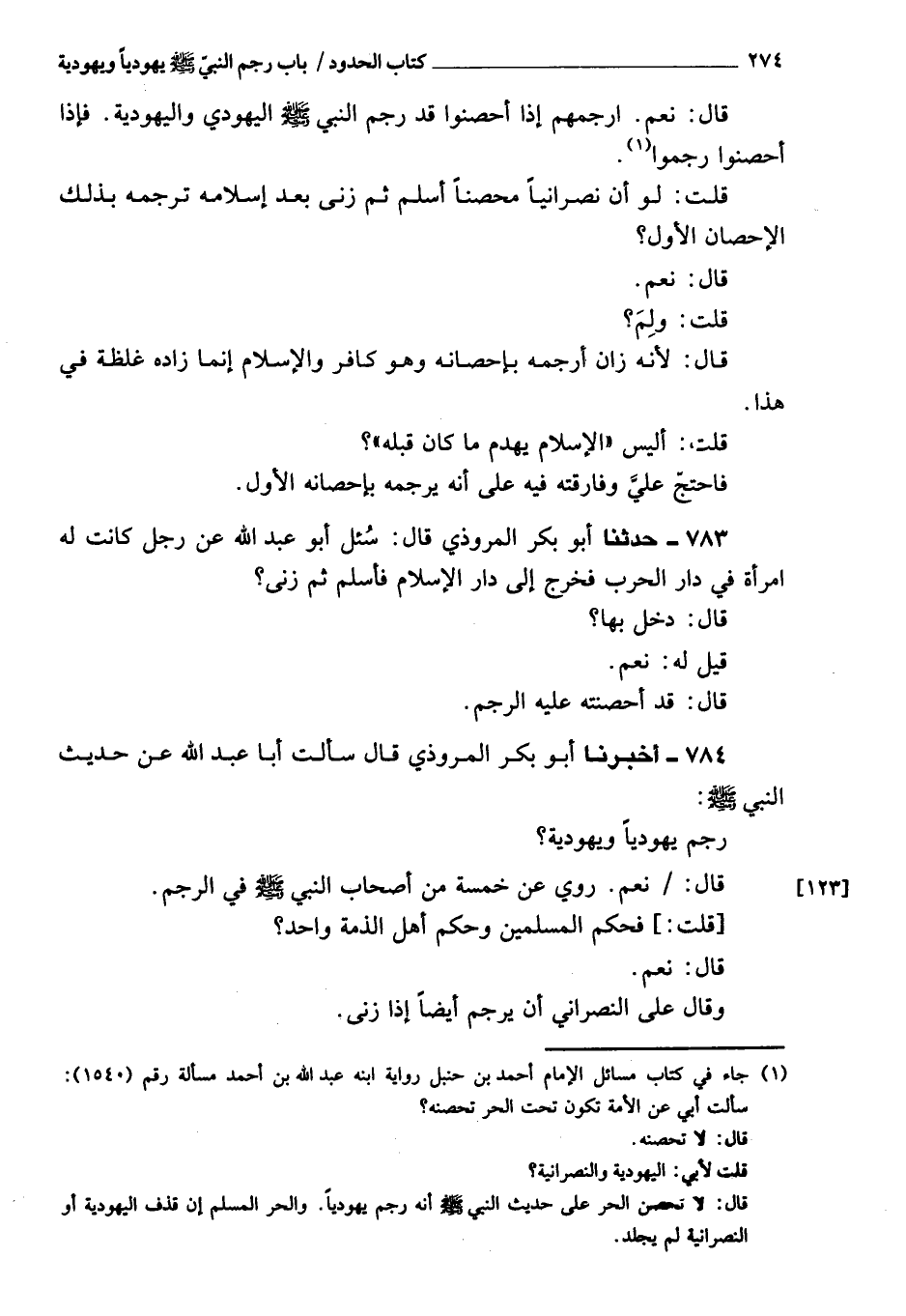 784 - أَخْبَرَنَا أبو بكر المروذي، قَالَ: سألت أبا عبد الله عن حديث النبي، صَلَّى اللَّهُ عَلَيْهِ وَسَلَّمَ، رجم يهوديا ويهودية؟ قَالَ: نعم، روي عن خمسة من أصحاب النبي، صَلَّى اللَّهُ عَلَيْهِ وَسَلَّمَ، في الرجم.