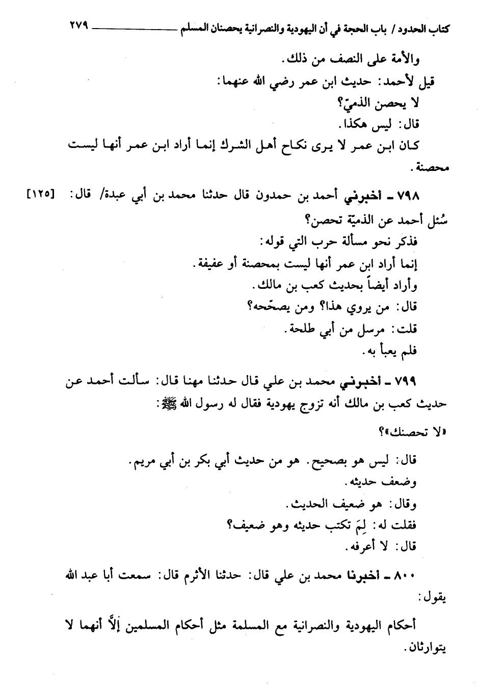 798 - أَخْبَرَنِي أحمد بن حمدويه، قَالَ: حَدَّثَنَا مُحَمَّد بن أبي عبيد، قَالَ: سئل أحمد عن الذميمة تحصن؟ فذكر نحو مسألة حرب الَّتِي هي قوله: إنما أراد ابن عمر أنها ليست بمحصنة، أو عفيفة، وأراد أيضا بحديث كعب بن مالك.