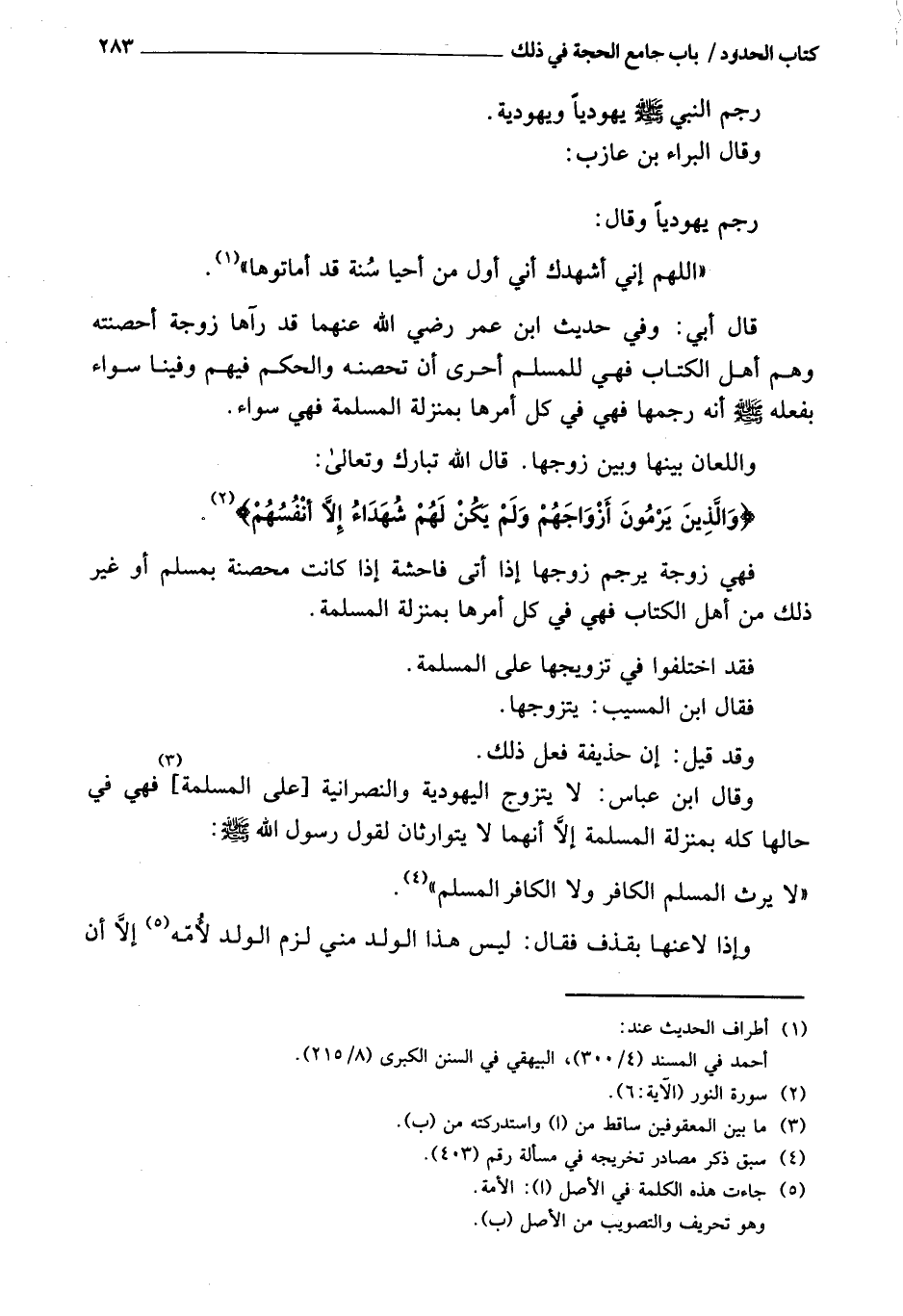 الحكم فيهم وفينا سواء بفعله، صَلَّى اللَّهُ عَلَيْهِ وَسَلَّمَ، أن رجمها، فهي فِي كل أمرها بمنزلة المسلمة، فهي سواء واللعان بينها وبين زوجها، قَالَ الله تبارك وتعالى: {وَالَّذِينَ يَرْمُونَ أَزْوَاجَهُمْ وَلَمْ يَكُنْ لَهُمْ شُهَدَاءُ إِلا أَنْفُسُهُمْ} [النور: 6] فهي زوجة يرجم زوجها إذا أتى فاحشة إذا كانت محصنة بمسلم، أو غير ذلك من أهل الكتاب، فهي فِي كل أمرها بمنزلة المسلمة، فقد اختلفوا فِي تزويجها عَلَى المسلمة، فَقَالَ ابن المسيب: يتزوجها.