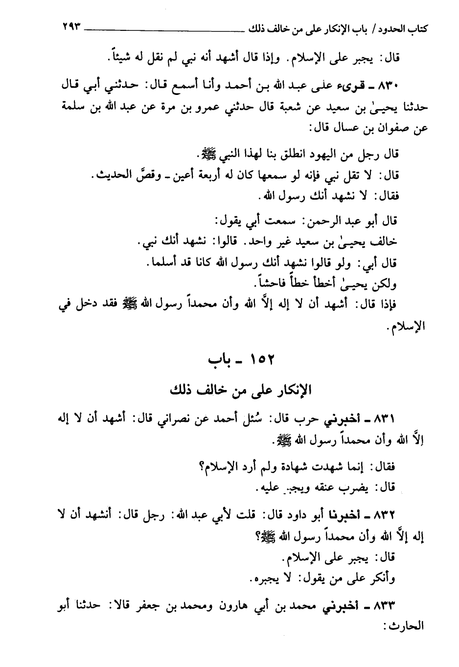 832 - أَخْبَرَنَا أبو داود، قَالَ: قلت لأبي عبد الله: رجل قَالَ: أشهد أن لا إله إلا الله، وأن محمدا رسول الله، صَلَّى اللَّهُ عَلَيْهِ وَسَلَّمَ؟ قَالَ: يجبر عَلَى الإسلام، وأنكر عَلَى من يقول: لا يجبر.
