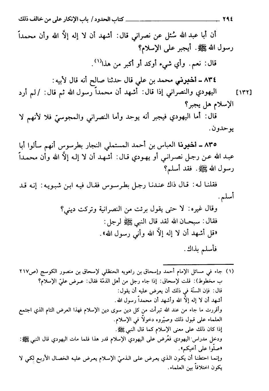 835 - أَخْبَرَنَا العباس بن أحمد المستلمي النجار بطرطوس، أنهم سألوا أبا عبد الله عن رجل نصراني، أو يهودي قَالَ: أشهد أن لا إله إلا الله، وأن محمدا رسول الله، صَلَّى اللَّهُ عَلَيْهِ وَسَلَّمَ؟ قَالَ: فقد أسلم.