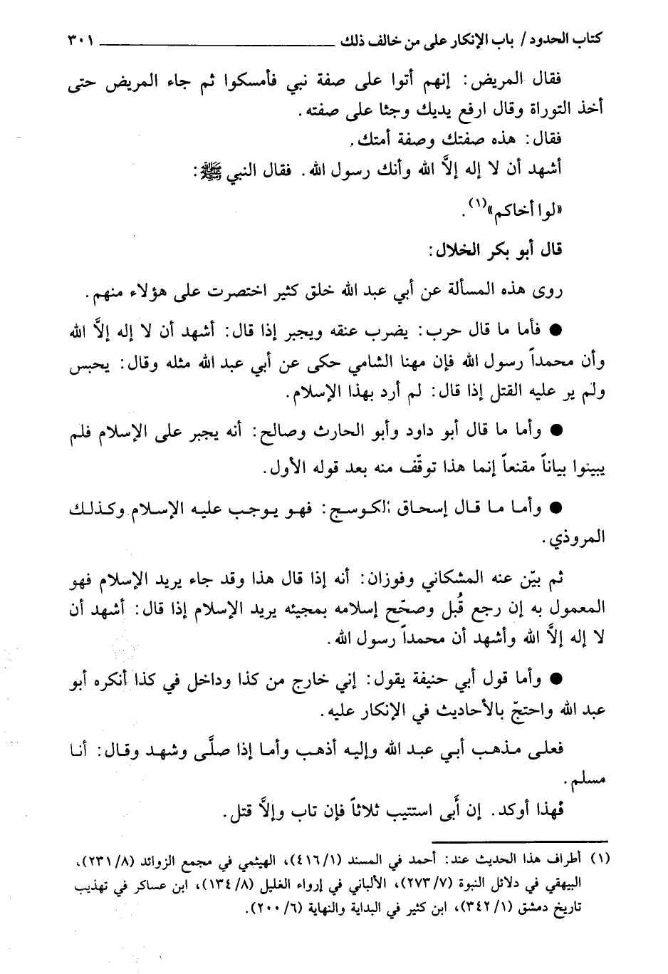 قال أبو بكر الخلال: رَوَى هذه المسألة عن أبي عبد الله خلق كثير، اقتصرت عَلَى هؤلاء مِنْهُ م؛ فأما مهنا الشامي: حكى عن أبي عبد الله مثله، وَقَالَ: يحبس، ولم ير عَلَيْهِ القتل؛ إذ قَالَ: لم أرد بهذا الإسلام.