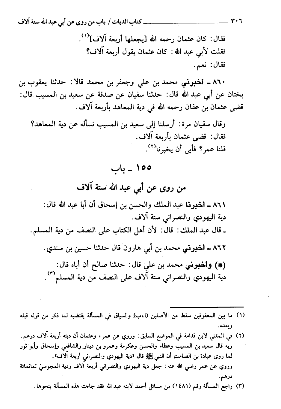 861 - أَخْبَرَنَا عبد الملك، والحسن بن إسحاق، أن أبا عبد الله قَالَ: دية اليهودي والنصراني ستة آلاف.