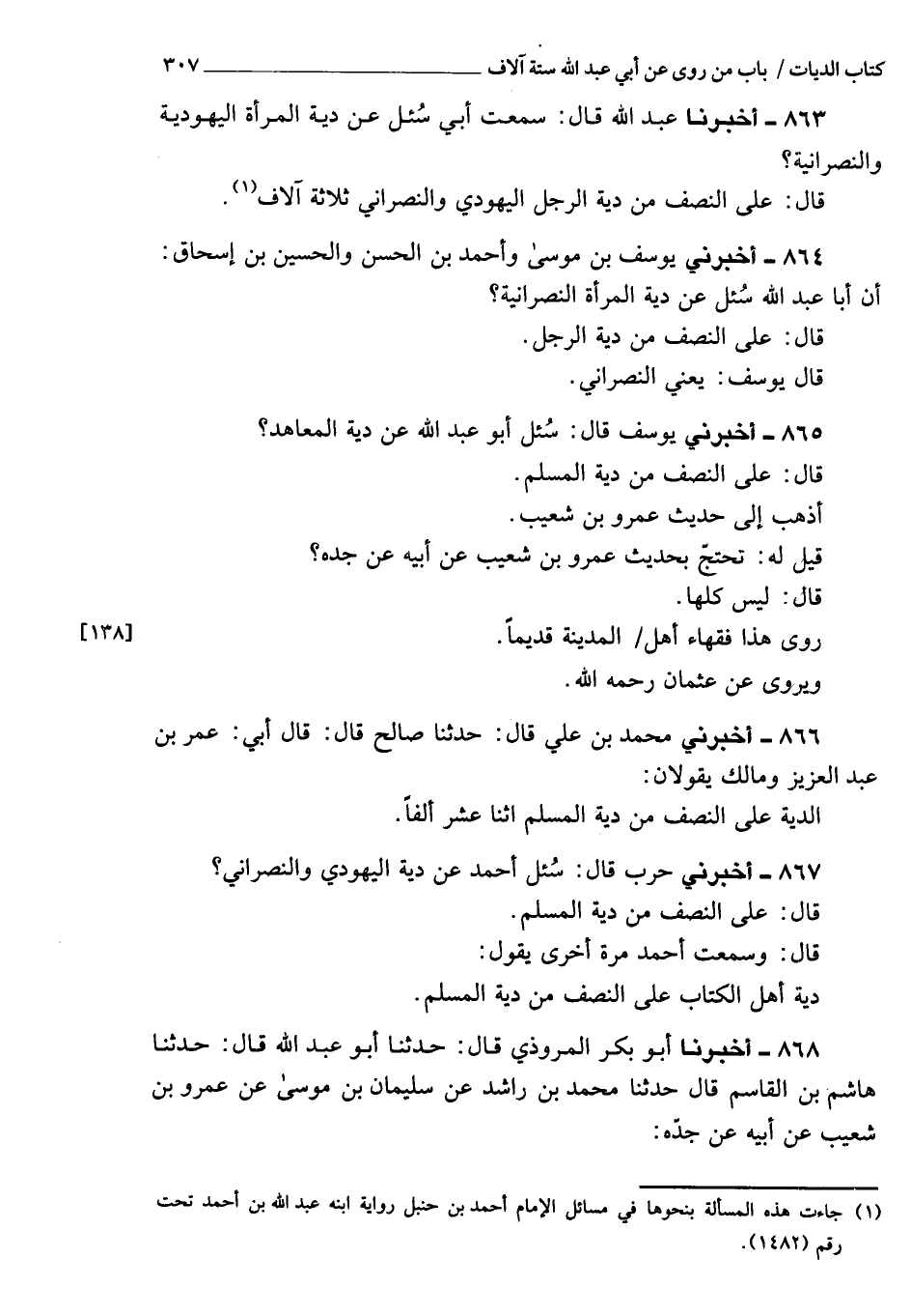 867 - أَخْبَرَنِي حرب، قَالَ: سئل أحمد عن دية اليهودي والنصراني؟ قَالَ: عَلَى النصف من دية المسلم، قَالَ: وسمعت أحمد مرة أخرى يقول: دية أهل الكتاب عَلَى النصف من دية المسلم.