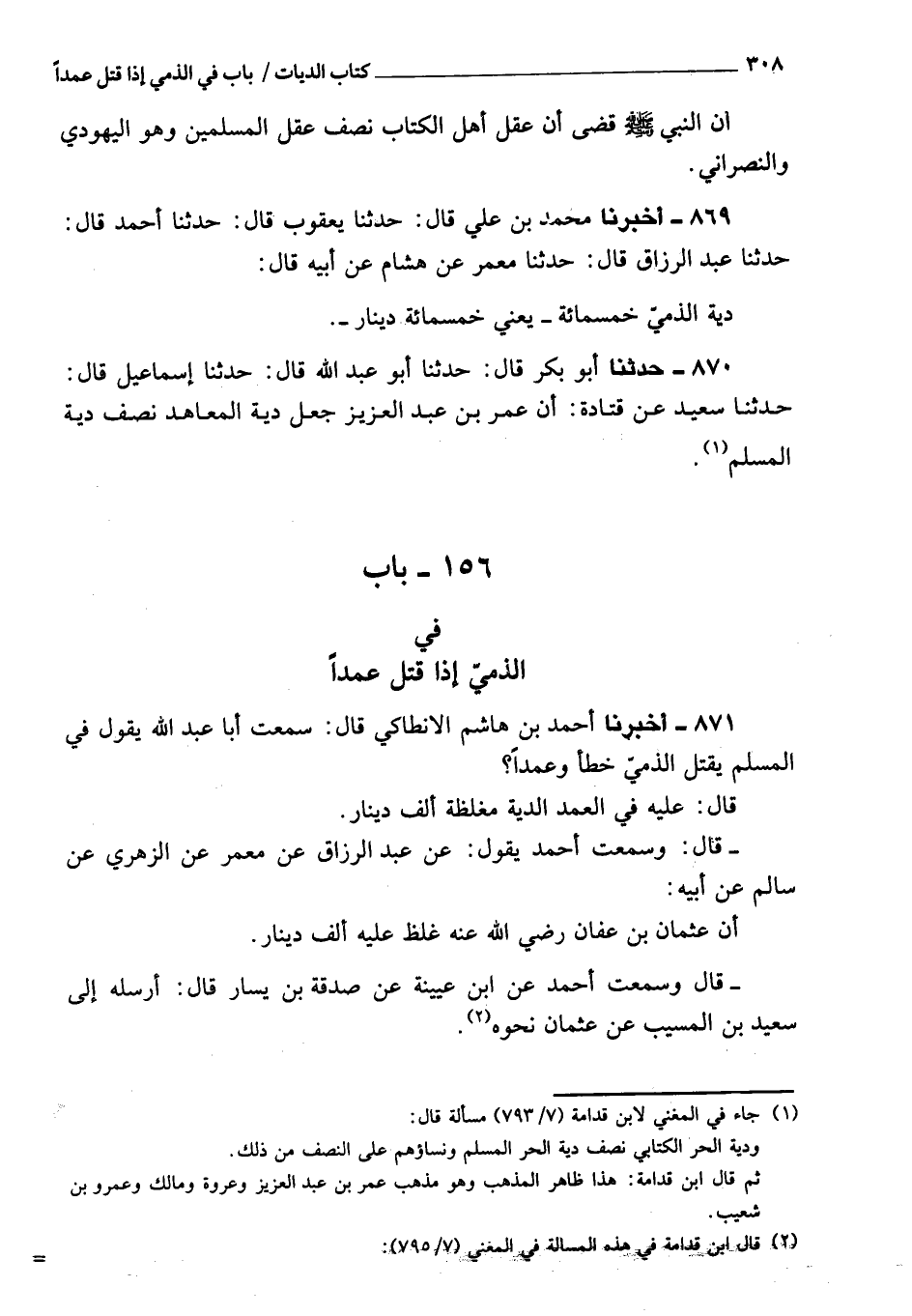 869 - أَخْبَرَنَا مُحَمَّد بن علي، قَالَ: حَدَّثَنَا يعقوب، قَالَ: حَدَّثَنَا أحمد، قَالَ: حَدَّثَنَا عبد الرزاق، قَالَ: حَدَّثَنَا معمر، عن هشام، عن أبيه، قَالَ: دية الذمي خمس مائة، يعني: خمس مائة دينار.
