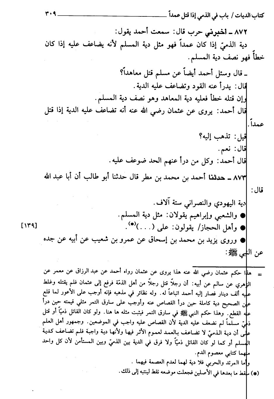 872 - أَخْبَرَنِي حرب، قَالَ: سمعت أحمد، يقول: دية الذمي إذا كان عمدا فهو مثل دية المسلم؛ لأنه يضاعف عَلَيْهِ إذا كان خطأ نصف دية المسلم.