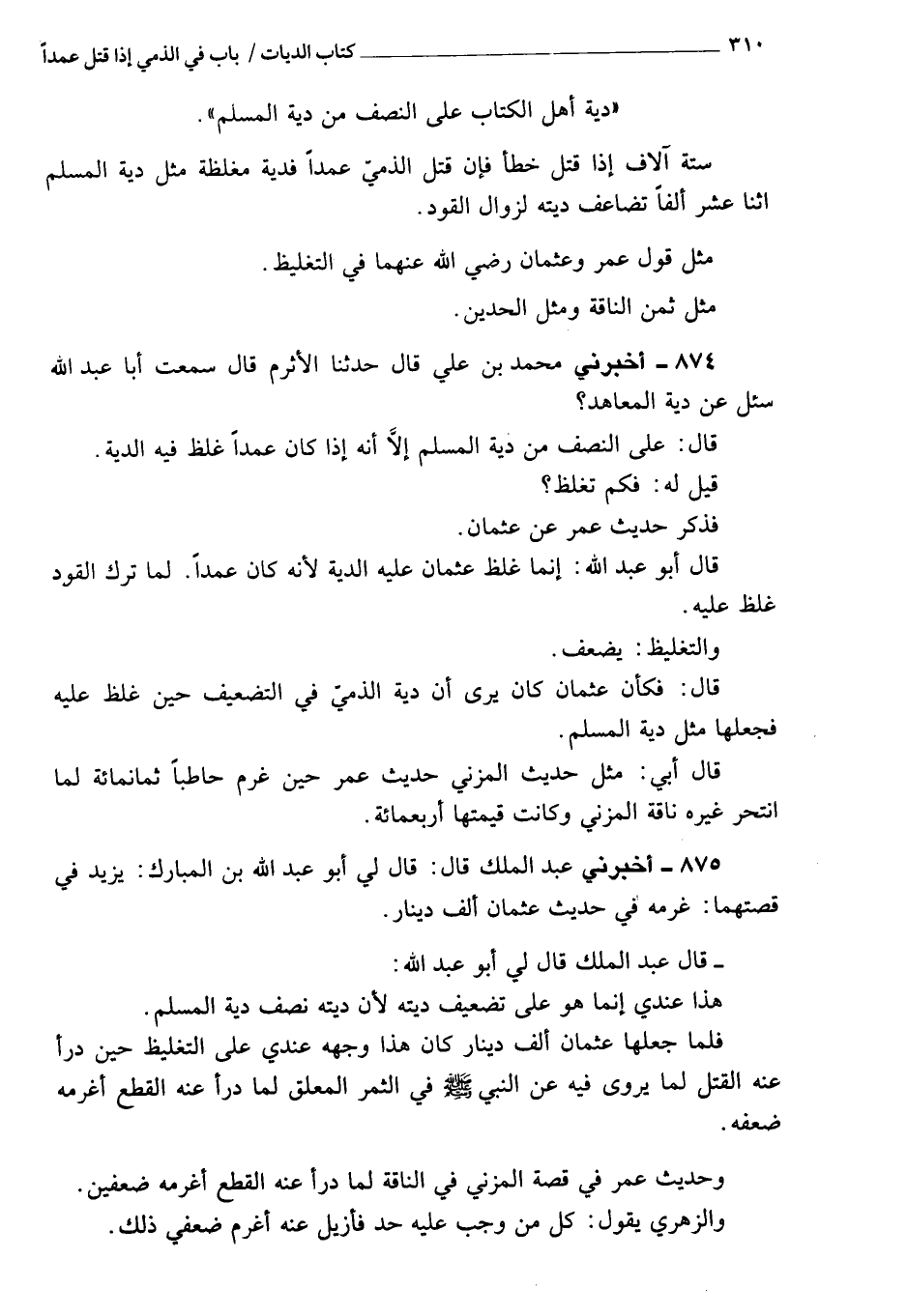 875 - أَخْبَرَنِي عبد الملك، قَالَ: قَالَ لي أبو عبد الله: ابن المبارك يزيد فِي قصتها غرمه فِي حديث عثمان ألف دينار، قَالَ عبد الملك: قَالَ لي أبو عبد الله: هذا عندي إنما هو عَلَى التضعيف ديته؛ لأن ديته نصف دية المسلم.
