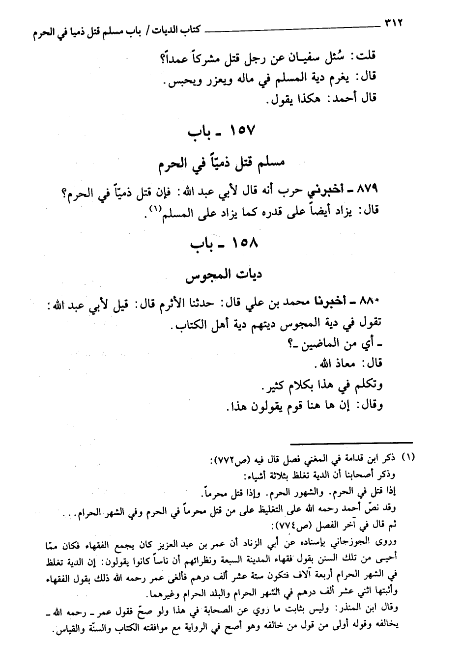 880 - أَخْبَرَنَا مُحَمَّد بن علي، قَالَ: حَدَّثَنَا الأثرم، قَالَ: قيل لأبي عبد الله تقول فِي دية المجوس: ديتهم دية أهل الكتاب، أي: من الماضين؟ قَالَ: معاذ الله.