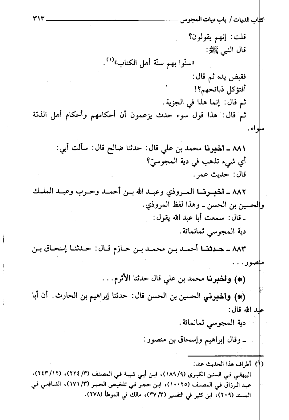 قُلْتُ: إنهم يقولون: قَالَ النبي، صَلَّى اللَّهُ عَلَيْهِ وَسَلَّمَ: «سنوا بهم سنة أهل الكتاب» فقبض يده، ثم قَالَ: أفنأكل ذبائحهم؟ ثم قَالَ: إنما هذا فِي الجزية، ثم قَالَ: هذا قول سوء حيث يزعمون أن أحكامهم وأحكام أهل الكتاب سواء.