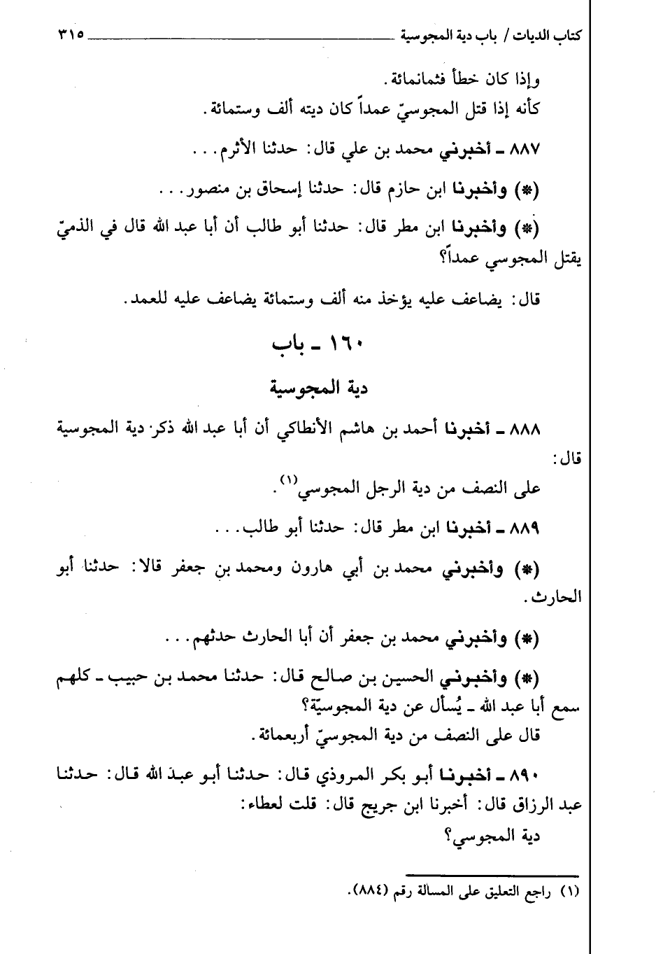 888 - أَخْبَرَنَا أحمد بن هاشم الأنطاكي، أن أبا عبد الله ذكر دية المجوسية، قَالَ: عَلَى النصف من دية الرجل المجوسي.