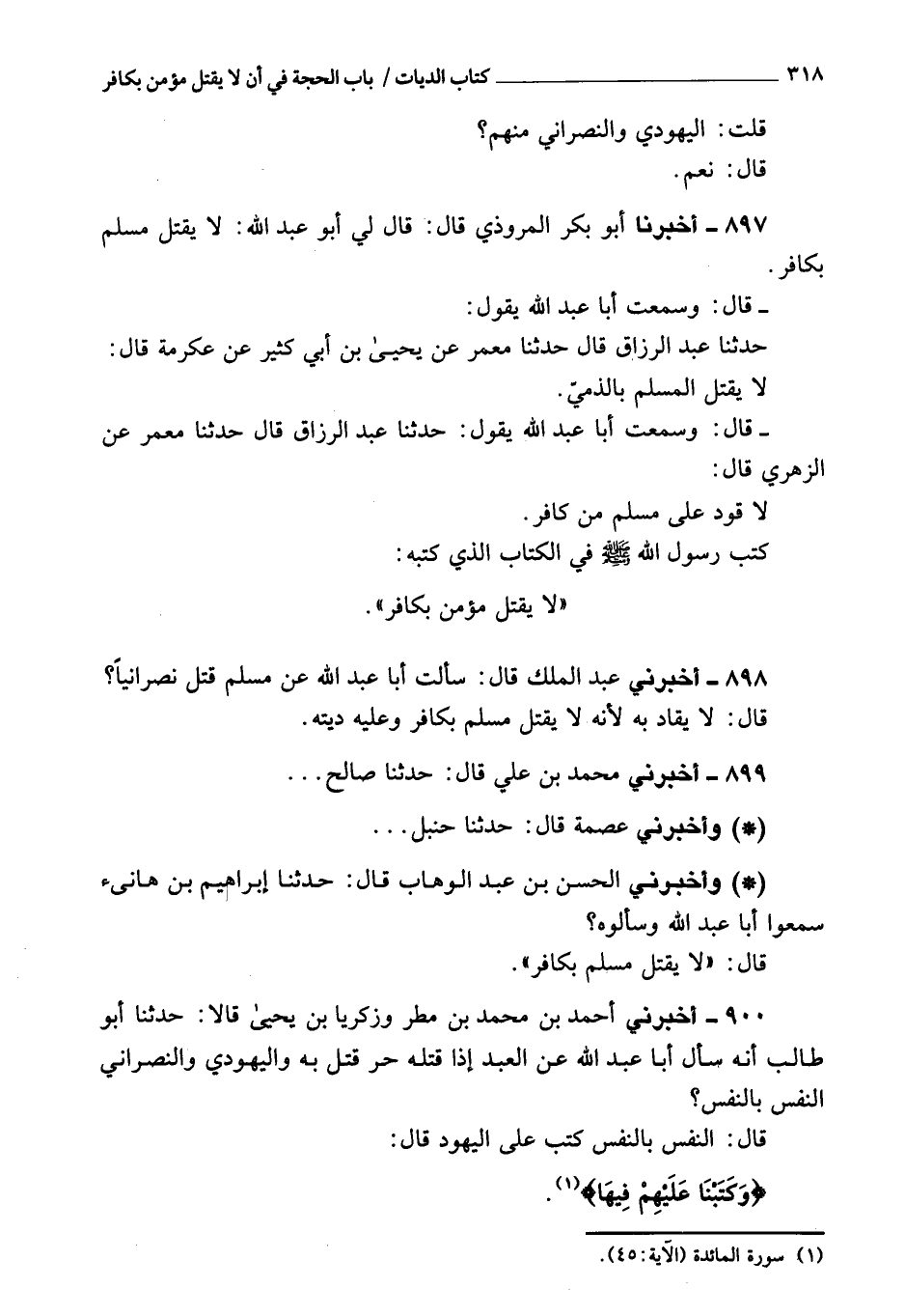 900 - أَخْبَرَنِي أحمد بن مُحَمَّد بن مطر، وزكريا بن يَحْيَى، قَالا: حَدَّثَنَا أبو طالب أنه سأل أبا عبد الله عن العبد إذا قتله حر قتل بِهِ، واليهودي والنصراني النفس بالنفس؟ قَالَ: النفس بالنفس كتب عَلَى اليهود، قَالَ: {وَكَتَبْنَا عَلَيْهِمْ فِيهَا} [المائدة: 45] التوراة.