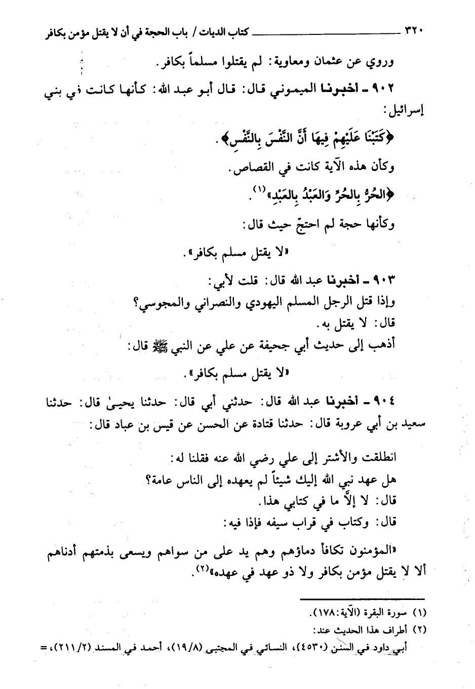 903 - أَخْبَرَنَا عبد الله، قَالَ: قلت لأبي: وإذا قتل الرجل المسلم اليهودي والنصراني والمجوسي؟ قَالَ: لا يقتل بِهِ.