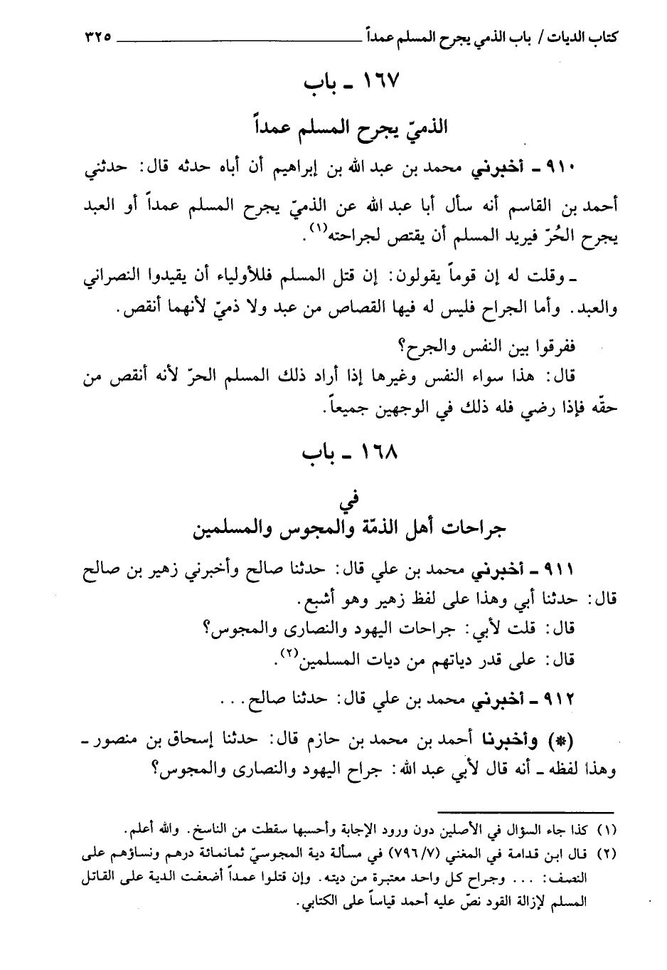 910 - أَخْبَرَنِي محمد بن عبد الله بن إبراهيم، أن أباه حدثه، قَالَ: حَدَّثَنِي أحمد بن القاسم، أنه سأل أبا عبد الله عن الذمي يجرح المسلم عمدا، والعبد يجرح الحر، فيريد المسلم أن يقتص لجراحته، وقلت له: إن قوما يقولون: إن قتل المسلم فللأولياء أن يقيدوا النصراني والعبد، وأما الجراح فليس فِيهَا القصاص من عبد ولا ذمي؛ لأنهما أنقص ففرقوا بين النفس، والجرح؟ قَالَ: هذا سواء.