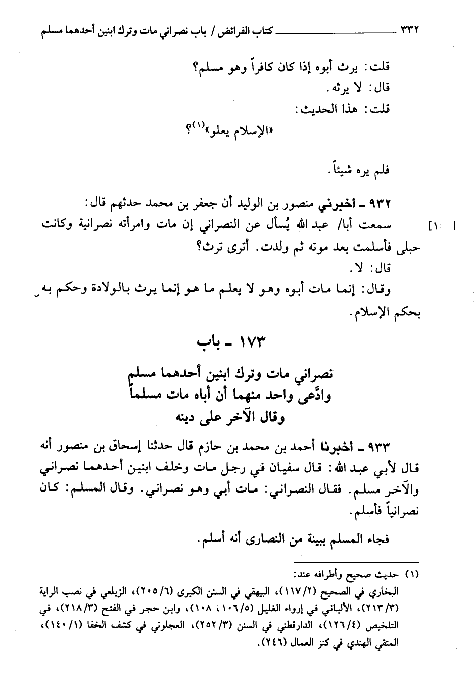 933 - أَخْبَرَنَا أحمد بن مُحَمَّد بن حازم، قَالَ: حَدَّثَنَا إسحاق بن منصور، أنه قَالَ لأبي عبد الله: قَالَ سفيان فِي رجل مات وخلف ابنين؛ أحدهما نصراني والآخر مسلم، فَقَالَ النصراني: مات أبي وهو نصراني، وَقَالَ المسلم: كان نصرانيا فأسلم، فجاء المسلم ببينة من النصارى أنه أسلم،