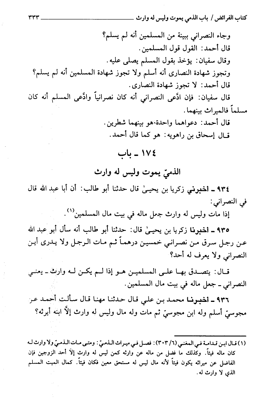 934 - أَخْبَرَنِي زكريا بن يَحْيَى، قَالَ: حَدَّثَنَا أبو طالب، أن أبا عبد الله قَالَ فِي النصراني إذا مات وليس له وارث، جعل ماله فِي بيت مال المسلمين.