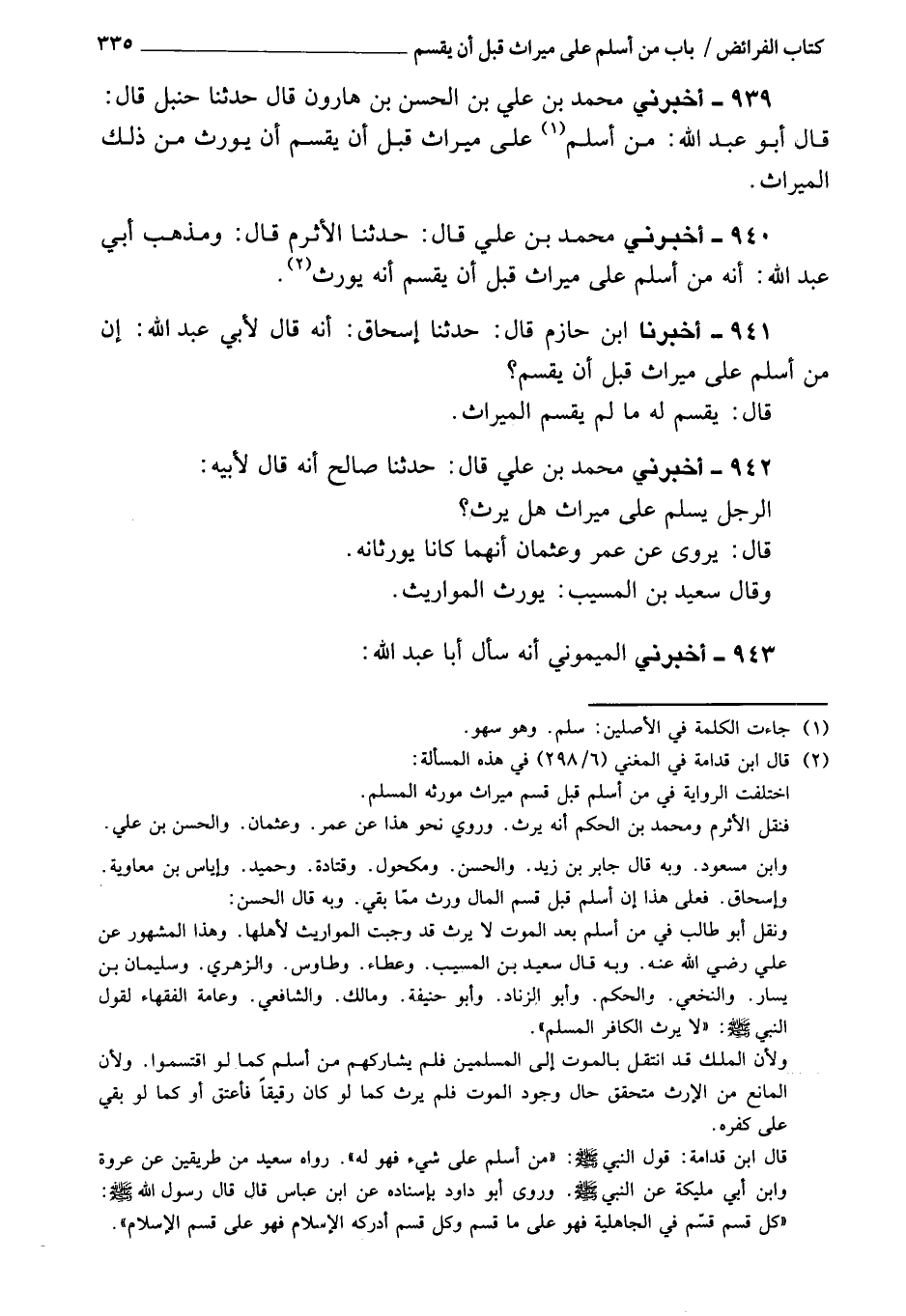 939 - أَخْبَرَنِي محمد بن علي بن الحسن بن هارون، قَالَ: حَدَّثَنَا حنبل، قَالَ: قَالَ أبو عبد الله: من أسلم عَلَى ميراث قبل أن يقسم أنه يورث من ذلك الميراث.