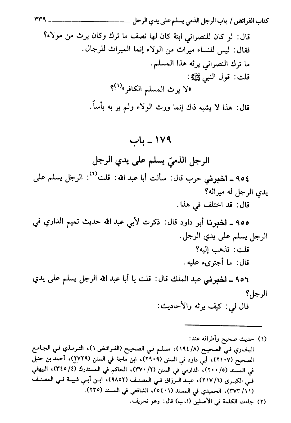 956 - أَخْبَرَنِي عبد الملك، قَالَ: قُلْتُ: يا أبا عبد الله، الرجل يسلم عَلَى يدي الرجل؟ قَالَ لي: كيف يرثه، والأحاديث: