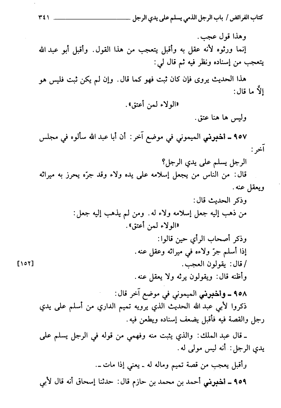 957 - أَخْبَرَنِي الميموني فِي موضع آخر، أن أبا عبد الله سألوه فِي مجلس آخر: الرجل يسلم عَلَى يدي الرجل، قَالَ: من الناس من يجعل إسلامه عَلَى يده ولاء، وقد جره يحرز بِهِ ميراثه، ويعقل عنه، وذكر الحديث، فَقَالَ: من يذهب إليه جعل إسلامه ولاء له، ومن لم يذهب إليه جعل الولاء فِي ميراثه وعقل عنه.