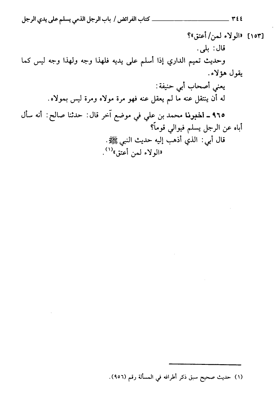 965 - أَخْبَرَنَا مُحَمَّد بن علي فِي موضع آخر، قَالَ: حَدَّثَنَا صالح، أنه سأل أباه عن الرجل يسلم فيوالي قوما؟ قَالَ أبي: الَّذِي أذهب إليه حديث النبي، صَلَّى اللَّهُ عَلَيْهِ وَسَلَّمَ: «الولاء لمن أعتق» .