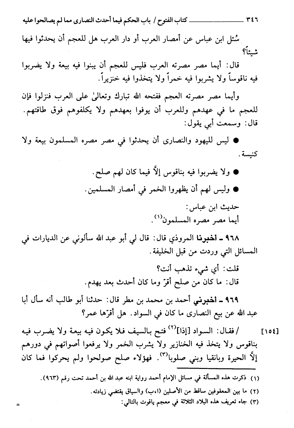 سُئِلَ ابْنُ عَبَّاسٍ عَنْ أَمْصَارِ الْعَرَبِ، أَوْ دَارِ الْعَرَبِ: هَلْ لِلْعَجَمِ أَنْ يُحْدِثُوا فِيهَا شَيْئًا؟ قَالَ: أَيُّمَا مِصْرٍ مَصَّرَتْهُ الْعَرَبُ فَلَيْسَ لِلْعَجَمِ أَنْ يَبْنُوا فِيهِ بِيعَةً، وَلا يَضْرِبُوا فِيهِ نَاقُوسًا، وَلا يَشْرَبُوا فِيهِ خَمْرًا، وَلا يَتَّخِذُوا فِيهِ خِنْزِيرًا، وَأَيُّمَا مِصْرٍ مَصَّرَتْهُ الْعَجَمُ، فَفَتَحَهُ اللَّهُ، تَبَارَكَ وَتَعَالَى، عَلَى الْعَرَبِ، فَنَزَلُوا، فَإِنَّ لِلْعَجَمِ مَا فِي عَهْدِهِمْ، وَعَلَى الْعَرَبِ أَنْ يُوفُوا بِعَهْدِهِمْ، وَلا يُكَلِّفُوهُمْ فَوْقَ طَاقَتِهِمْ.