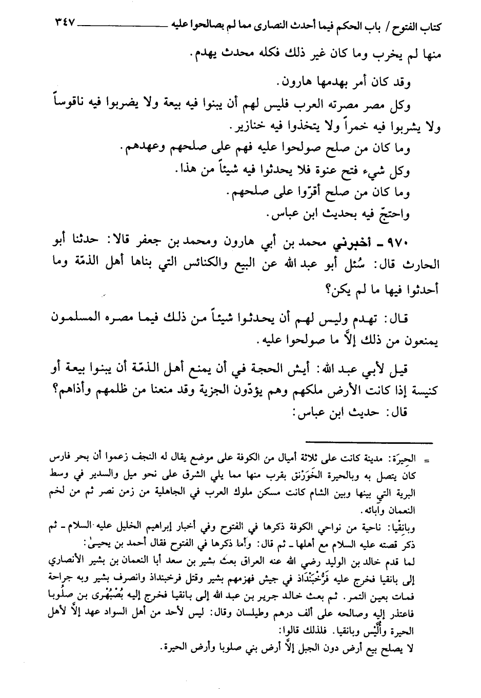 وقد كان أمر بهدمها هارون، وكل مصر مصرته العرب فليس لهم أن يبنوا فِيهِ بيعة، ولا يضربوا فِيهِ ناقوسا، ولا يشربوا فِيهِ خمرا، ولا يتخذوا فِيهِ خنزيرا، وما كان من صلح صولحوا عَلَيْهِ فهم عَلَى صلحهم، وعهدهم، وكل شيء فتح عنوة فلا يحدث فِيهِ شيء من هذا، وما كان من صلح أقروا عَلَى صلحهم.