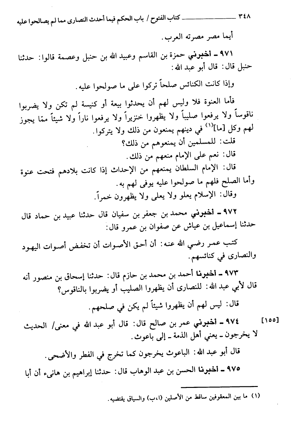 971 - أَخْبَرَنِي حمزة بن القاسم، وعبيد بن حنبل، وعصمة، قَالُوا: حَدَّثَنَا حنبل، قَالَ: قَالَ أبو عبد الله: وإن كانت الكنائس صلحا تركوا عَلَى ما صولحوا عَلَيْهِ، فأما العنوة فلا، وليس لهم أن يحدثوا بيعة، أو كنيسة لم تكن، ولا يضربوا ناقوسا، ولا يرفعوا صليبا، ولا يظهروا خنزيرا، ولا يرفعوا نارا، ولا شيئا مما يجوز لهم، وكل ما فِي دينهم يمنعون من ذلك ولا يتركوا؟ قُلْتُ: للمسلمين أن يمنعوهم من ذلك؟ قَالَ: نعم، عَلَى الإمام منعهم من ذلك، قَالَ: الإمام السلطان يمنعهم من الإحداث إذا كانت بلادهم فتحت عنوة، وأما الصلح فلهم ما صولحوا عَلَيْهِ، يوفى لهم بِهِ.